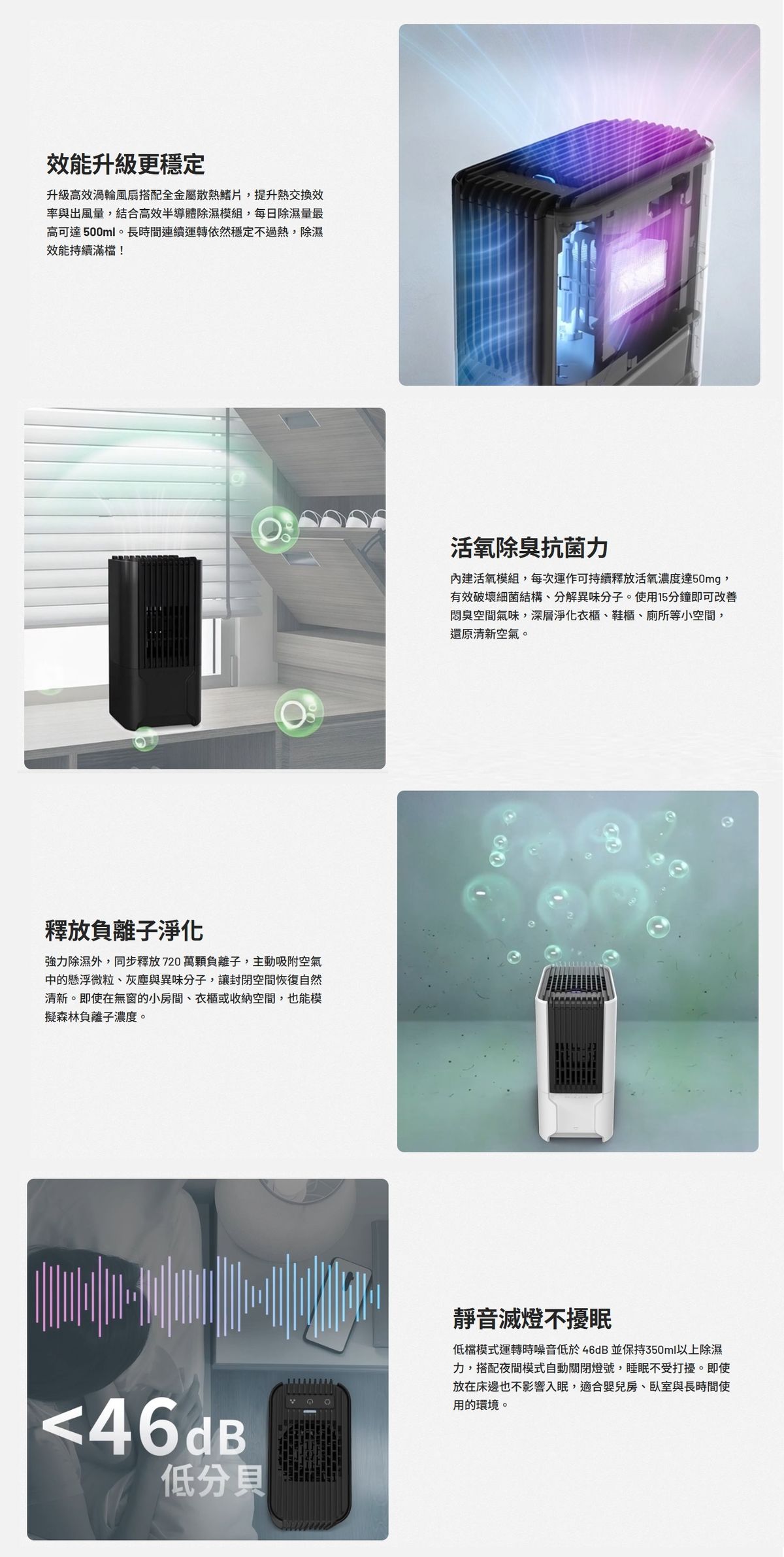 - 除濕能力:高檔 500ml/日、低檔 350ml/日(30°C / 80% RH)