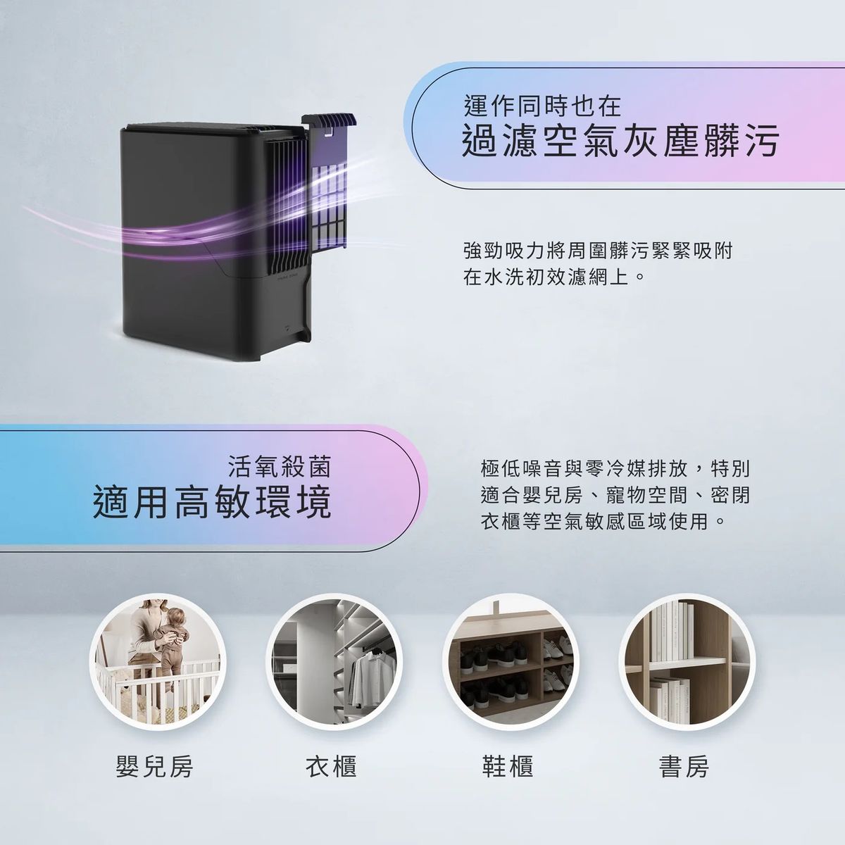 臥室、客廳、小套房也能用,一台能淨化約7坪空間。