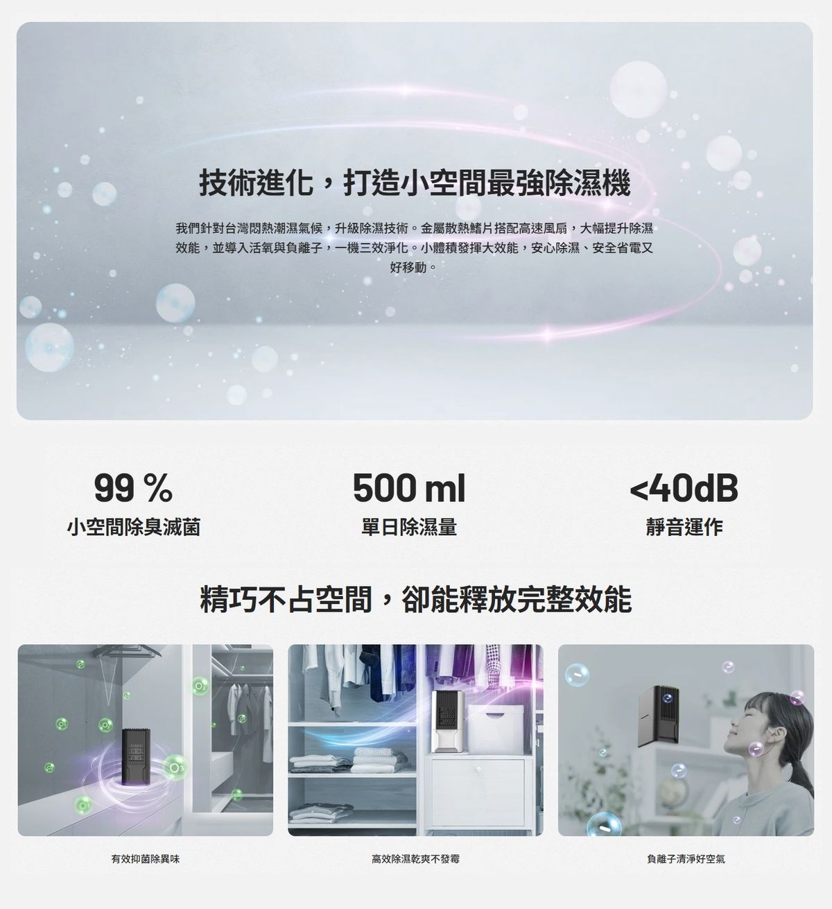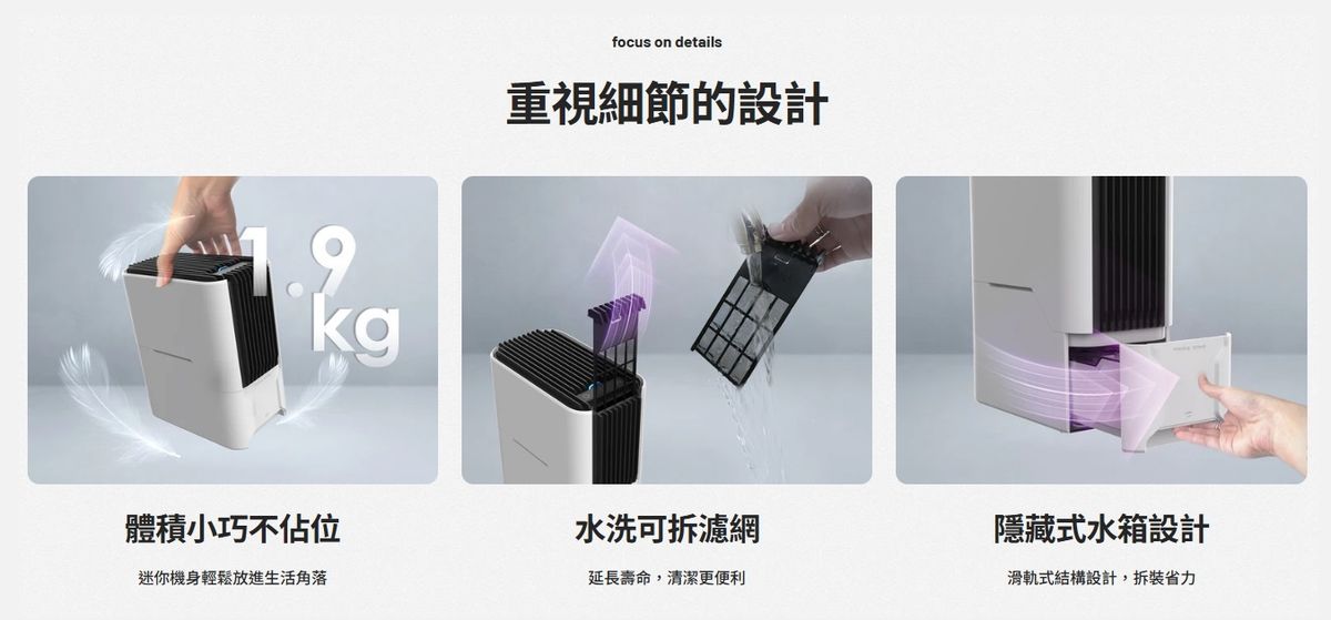 使用渦輪加壓抽風馬達,能快速蒐集小範圍內的所有濕氣,並透過雙面晶片凝結、轉熱送出,讓空間內濕感去除同時升溫。