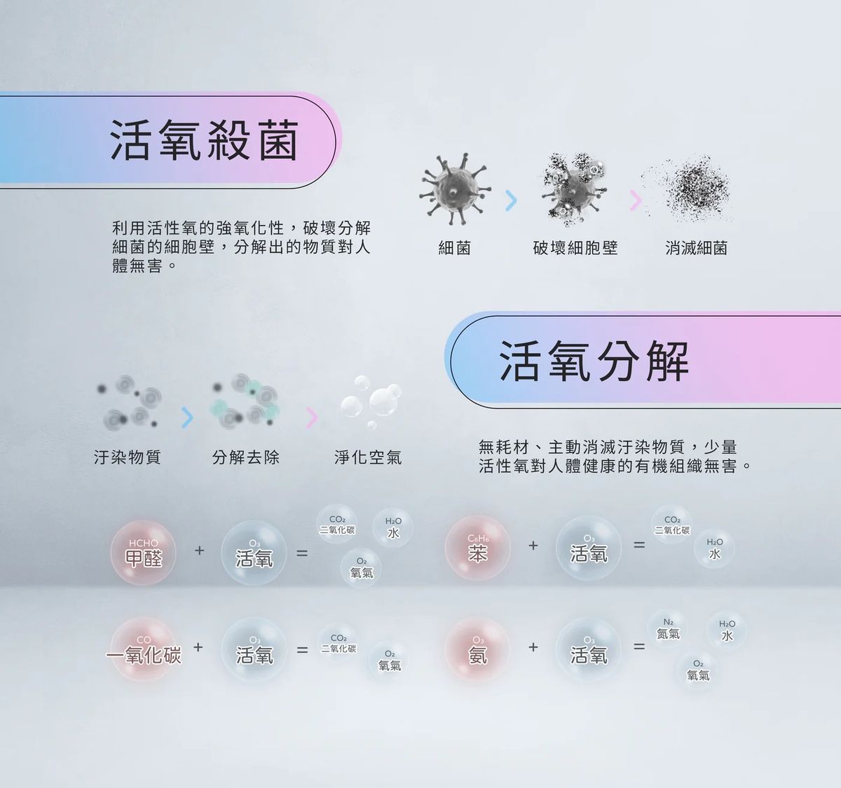 支援活氧殺菌模式,將看不見的病菌,全都殺光,不論是飄在空氣中、附著在物體上的細菌,都能有效破壞,讓空間、衣物、毛巾保持乾淨。